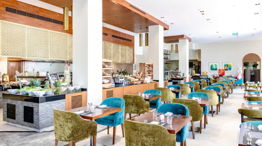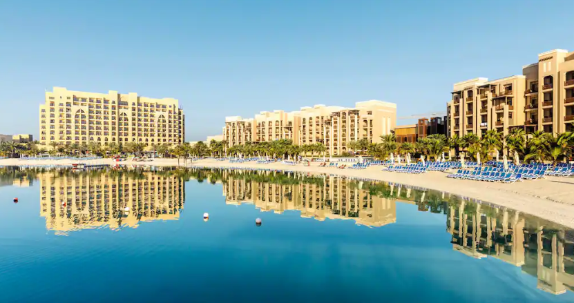 This luxurious hotel stretches out along a private white-sand beach on the exclusive Marjan Island.