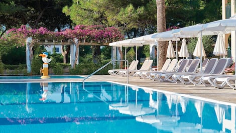 Set in a quiet spot with palms and pines, the apartments have their own pool with a wraparound sun terrace and snack bar. Then there’s three pools, a buffet restaurant and activities across the street at the sister hotel.