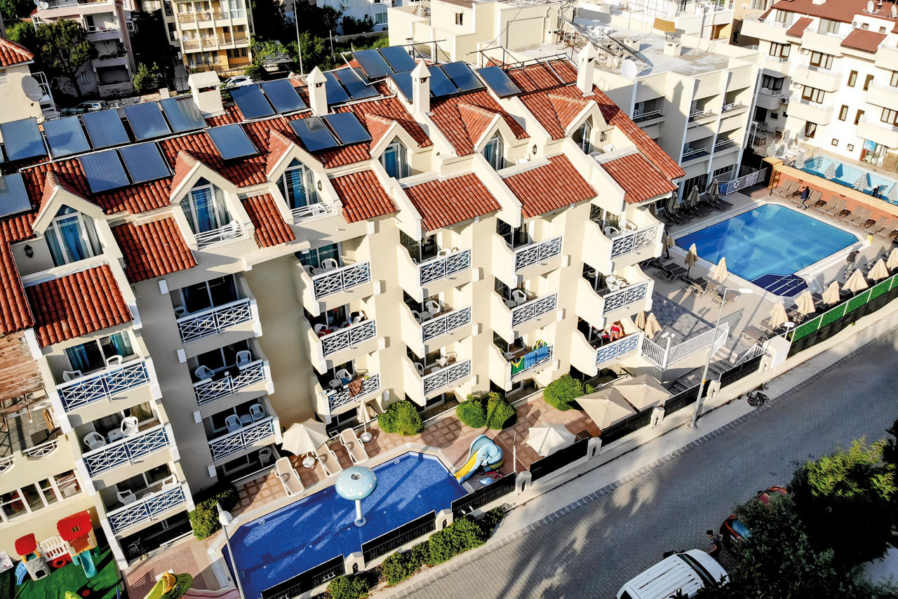 The family-run Blue Palace Hotel is in a quiet residential area, backed with picturesque orange trees and fields and with easy access to the beach and Marmaris resort centre. Rooms are bright and airy with a tropical theme to keep you in the holiday mood all day and night. Great for families and couples wanting to be in a peaceful area, yet close to everything they could need for a fantastic holiday in Turkey. Standard Double and Twin rooms sleep up to 3 adults or 2 adults and 1 child and have a bathroom with shower, hairdryer, ceiling fan, air conditioning*, flat screen satellite TV, kettle, Wi-Fi* and a balcony or terrace. Family rooms sleeping up to 4 adults or 2 adults and 2 children with double or twin beds plus sofa beds in the living area, a full bathroom, air conditioning (in the bedroom). Standard Double and Twin room for Sole use and Half Board are also available.
