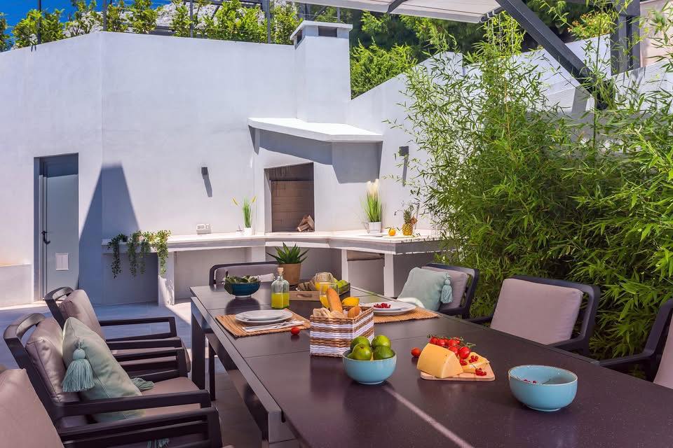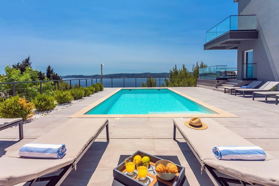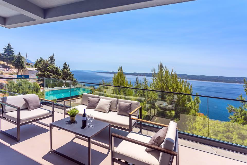 Villa Centar is a newly built villa with high quality and stylish furnishings, offering very comfortable accommodation for 8 people. It is fully air-conditioned with free Wi-Fi, with all of the required home appliances in the kitchen, a spacious living room with sea views and balcony, 4 bedrooms (each with ensuite), a sauna and gym, 2 electric bicycles and amazing views of the Adriatic Sea, mountains and Brač island from almost every corner.The outdoor area offers a covered dining space with a barbecue and direct entrance to the kitchen. The outdoor staircase takes you down to the private pool with hydro massage, amazing sea views and a spacious sun deck area
